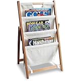 This modern magazine rack features three pockets in a tiered form, for holding your favorite reference materials such as magazines, newspapers, maps, and books.With a folding wood frame and carrying handle, the magazine display rack can be easily stored or taken on the go!The folding magazine rack is made of wood with 100% cotton canvas material, for a simplistic look that efficiently does the job! .