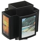 Give it a spin to keep all of your TV essentials with easy reach. This revolving caddy features 5 spacious compartments to hold remote controls, program guides, eyeglasses and more. Plus, for your favorite viewing, it has 4 built in picture frames - perfect for photos of family and friends. Made of handsome, hi-tech plastic, with protective padded base. 6 1/2 inches x 5 1/4 inches x 6 1/4 inches tall.